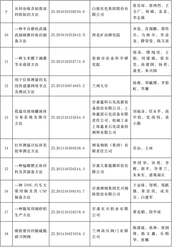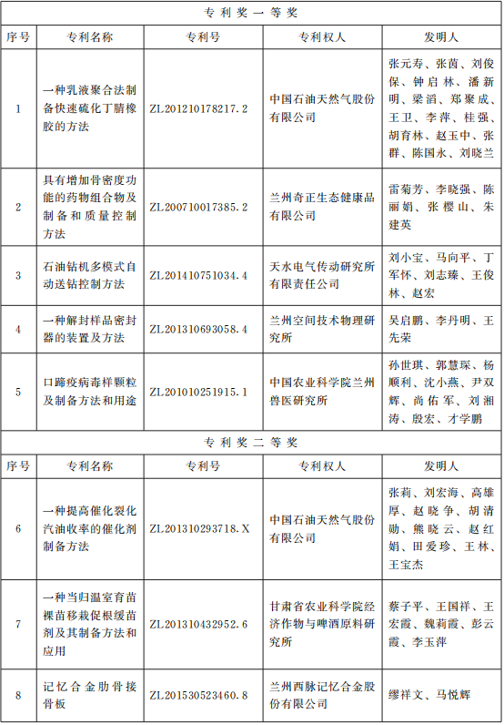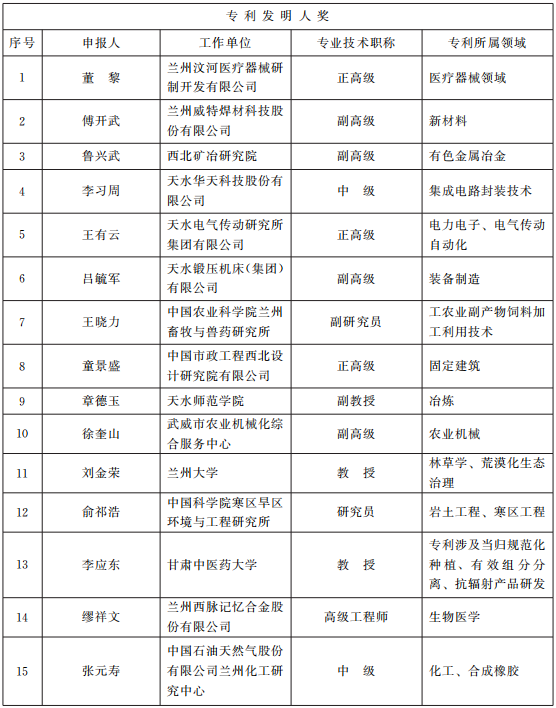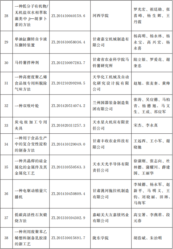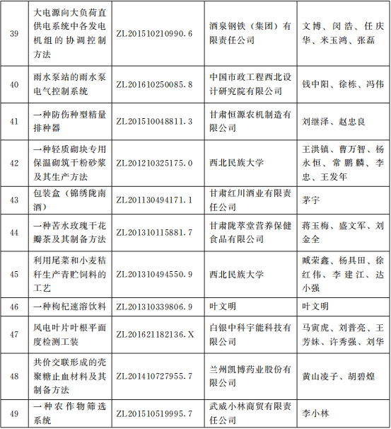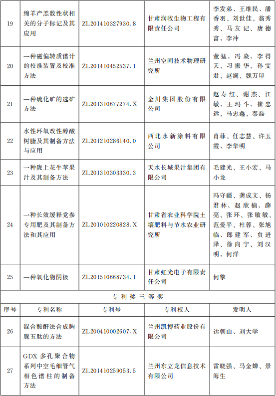 附件:2019年度甘肅省專利獎勵(lì)名單