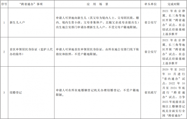 2020年底前,完成40%的清單內高頻政務服務事項(詳見附件1)“省內通辦”、國家發(fā)布的第一批事項(詳見附件2)“跨省通辦”;2021年底前,基本實現(xiàn)高頻政務服務事項“跨省通辦”“省內通辦”。同步建立清單化管理制度和動態(tài)調整更新機制,并逐步納入其他辦事事項,更好滿足各類市場主體和人民群眾異地辦事需求。