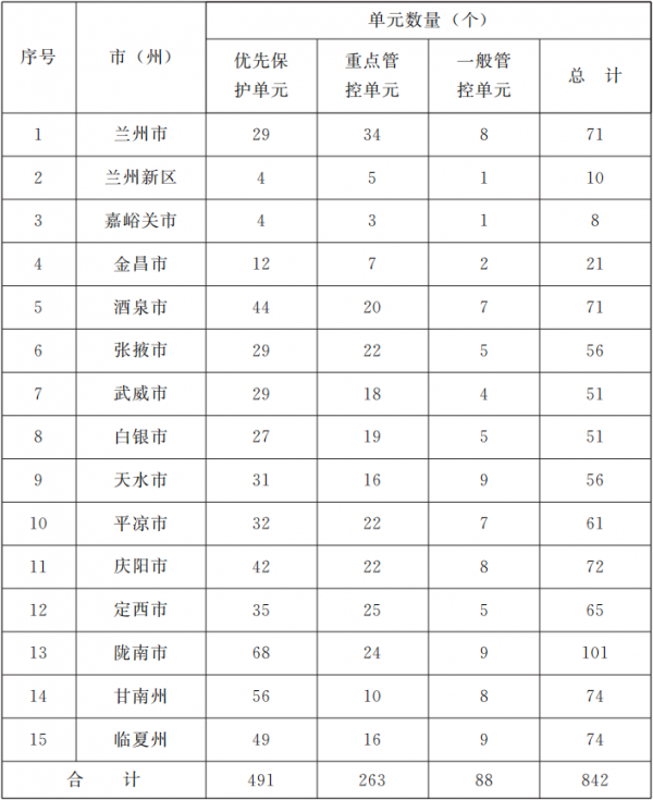 甘肅省各市(州)生態(tài)環(huán)境管控單元劃定匯總表
