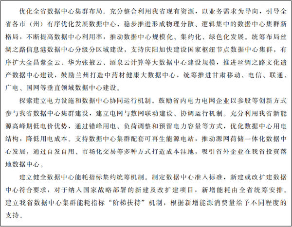 ????圍繞全國(guó)一體化算力網(wǎng)絡(luò)國(guó)家樞紐節(jié)點(diǎn)(甘肅)建設(shè),統(tǒng)籌優(yōu)化全省數(shù)據(jù)中心布局,引導(dǎo)傳統(tǒng)數(shù)據(jù)中心升級(jí)改造,向規(guī)?;?、集約化、智能化、綠色化方向布局發(fā)展。探索建立電力設(shè)施和數(shù)據(jù)中心協(xié)同運(yùn)行機(jī)制、數(shù)據(jù)中心能耗指標(biāo)共享統(tǒng)籌機(jī)制。