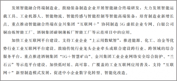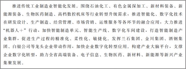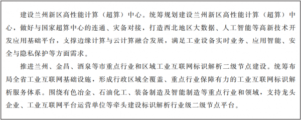 ????圍繞沿黃河流域、河西走廊、隴東南三大產(chǎn)業(yè)聚集帶的空間布局,聚焦石化、能源、冶金、裝備制造等重點(diǎn)行業(yè),打造智能制造產(chǎn)業(yè)集群,全面提升企業(yè)數(shù)字化水平,形成智能制造為驅(qū)動(dòng)的新型工業(yè)體系。