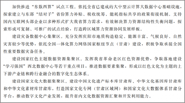 ????按照國(guó)家要求,建設(shè)甘肅省一體化大數(shù)據(jù)中心協(xié)同創(chuàng)新體系,引導(dǎo)數(shù)據(jù)中心集約化、規(guī)模化、綠色化發(fā)展。充分發(fā)揮我省資源優(yōu)勢(shì),重點(diǎn)提升算力服務(wù)品質(zhì)和利用效率,積極承接后臺(tái)加工、離線分析、存儲(chǔ)備份等非實(shí)時(shí)算力需求,打造面向全國(guó)的非實(shí)時(shí)性算力保障基地。