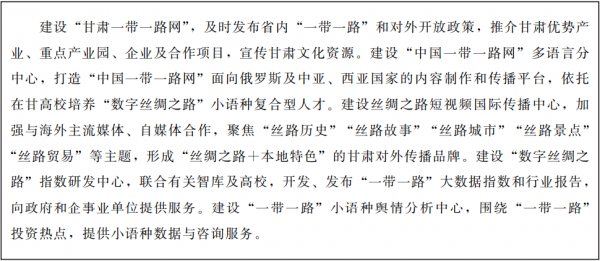 ????推進(jìn)海外數(shù)據(jù)在甘肅匯集、分析、落地應(yīng)用,加強(qiáng)同“一帶一路”沿線國(guó)家在數(shù)字化、網(wǎng)絡(luò)化、智能化方面的國(guó)際合作,促進(jìn)文化國(guó)際傳播交流,打造“數(shù)字絲綢之路”的重要門戶和核心節(jié)點(diǎn)。