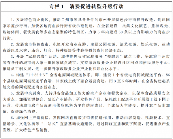 ????建設(shè)區(qū)域性消費中心城市。加強城市消費硬環(huán)境建設(shè),完善消費基礎(chǔ)設(shè)施,提升消費便利度,著重優(yōu)化消費軟環(huán)境,美化市容市貌,提升消費舒適度。擴大國際國內(nèi)一線品牌設(shè)立專柜或?qū)Yu店、體驗店、旗艦店范圍,聚集優(yōu)質(zhì)消費資源,推動消費融合創(chuàng)新,提升高品質(zhì)商業(yè)文化,加快培育蘭州、天水、酒泉、張掖、慶陽等一批特色化區(qū)域性消費中心城市。