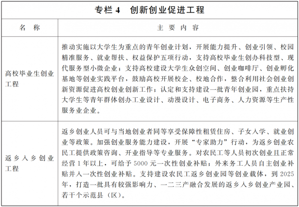 ????實施鄉(xiāng)村振興促進(jìn)返鄉(xiāng)創(chuàng)業(yè)就業(yè)。全面實施鄉(xiāng)村振興戰(zhàn)略,依托現(xiàn)有各類園區(qū)加強返鄉(xiāng)入鄉(xiāng)創(chuàng)業(yè)園建設(shè),打造一批具有較強影響力的一二三產(chǎn)融合發(fā)展的返鄉(xiāng)入鄉(xiāng)創(chuàng)業(yè)園。改造提升返鄉(xiāng)入鄉(xiāng)創(chuàng)業(yè)園配套設(shè)施,進(jìn)一步完善水電路氣暖等公共設(shè)施,合理配套標(biāo)準(zhǔn)化廠房、培訓(xùn)平臺、交通物流倉儲設(shè)施,加大金融、土地、稅費等扶持力度。鼓勵各類勞動者到農(nóng)村就業(yè)創(chuàng)業(yè),對符合政策規(guī)定條件的返鄉(xiāng)入鄉(xiāng)人員,納入省級創(chuàng)業(yè)帶動就業(yè)扶持資金支持范圍,并按規(guī)定給予補助。對高校畢業(yè)生、農(nóng)民工、退役軍人等返鄉(xiāng)入鄉(xiāng)人員到農(nóng)村創(chuàng)新創(chuàng)業(yè)的,可按規(guī)定享受創(chuàng)業(yè)擔(dān)保貸款、一次性創(chuàng)業(yè)補助、場地安排、創(chuàng)業(yè)培訓(xùn)等扶持政策。