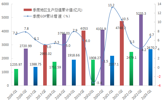 省委省政府認(rèn)真貫徹中央經(jīng)濟(jì)工作會(huì)議精神,印發(fā)實(shí)施《促進(jìn)經(jīng)濟(jì)穩(wěn)中有進(jìn)推動(dòng)高質(zhì)量發(fā)展若干政策措施》《三抓三促行動(dòng)方案》,建立經(jīng)濟(jì)運(yùn)行調(diào)度制度,圍繞促增長、求突破,以超常之力抓工業(yè)、以恒久之力抓農(nóng)業(yè)、以務(wù)實(shí)之策抓項(xiàng)目、以創(chuàng)新之舉抓消費(fèi),開展“優(yōu)化營商環(huán)境攻堅(jiān)突破年行動(dòng)”,一季度經(jīng)濟(jì)運(yùn)行整體好轉(zhuǎn),主要經(jīng)濟(jì)指標(biāo)超預(yù)期運(yùn)行,實(shí)現(xiàn)地區(qū)生產(chǎn)總值2670.7億元,同比增長6.7%,高于全國2.2個(gè)百分點(diǎn)。其中,第一產(chǎn)業(yè)增加值190.1億元,增長6.4%;第二產(chǎn)業(yè)增加值889.2億元,增長6.2%;第三產(chǎn)業(yè)增加值1591.4億元,增長7%。
