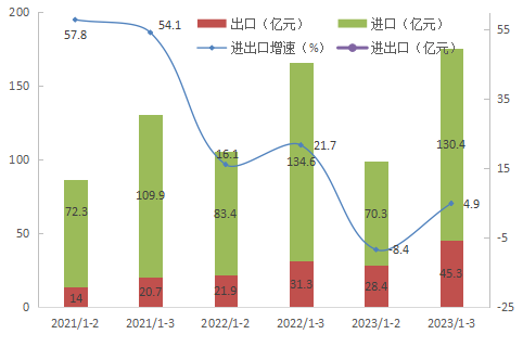 圖4??2021-2023年月度累計(jì)進(jìn)出口總額及增速