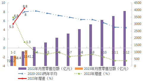 圖2??2021-2023年月度累計(jì)社會(huì)消費(fèi)品零售總額及增速(%)