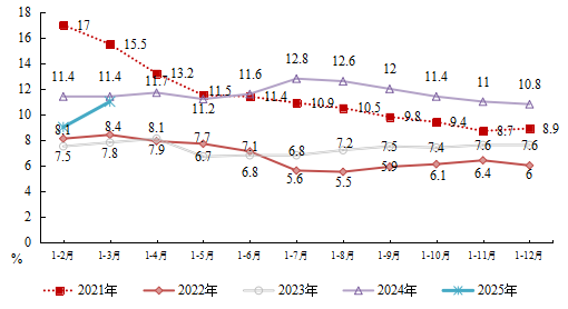 圖4 ?2021—2025年固定資產(chǎn)投資月度累計增速(%)