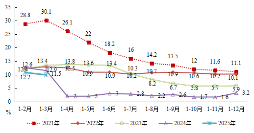 圖2 ?2021—2025年工業(yè)增加值月度累計增速(%)
