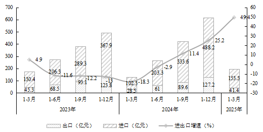 一是對外貿(mào)易質(zhì)效并重。制定實施加力推動高質(zhì)量發(fā)展高水平開放18條措施,外貿(mào)聯(lián)盟企業(yè)規(guī)模增至65家,持續(xù)推動“甘貨回甘、甘數(shù)甘統(tǒng)”。一季度,全省進出口總值194.7億元,增長49.4%、增速居全國第2位(見圖5);其中,出口41.4億元,同比增長45%、增速居全國第2位;進口153.3元,增長50.7%、增速居全國第2位;與共建“一帶一路”國家進出口147.6億元,增長45.4%,占全省外貿(mào)總值的75.8%。制定實施打造國家向西開放戰(zhàn)略通道行動方案,蘭州確定為中歐班列節(jié)點城市,納入西北區(qū)域中歐班列集結網(wǎng)絡。一季度新設外資企業(yè)18家,實際利用外資1343萬美元;國際貨運班列發(fā)運36列2300車,貨值7000萬美元,總發(fā)運車數(shù)增長12.4%。二是營商環(huán)境持續(xù)優(yōu)化。制定實施全省優(yōu)化營商環(huán)境全面提升年行動方案,深化“高效辦成一件事”改革,平均辦理時限壓減59.3%,跑動次數(shù)減少91.3%。一季度新設立經(jīng)營主體7.22萬戶,其中新設立企業(yè)2.11萬戶,同比增長21.66%;新入庫四上單位1424戶,退庫764戶,凈增660戶,批零住餐業(yè)、規(guī)上服務業(yè)、規(guī)上工業(yè)分別凈增511戶、181戶和126戶,共818戶。加大助企紓困力度,啟動實施《民營經(jīng)濟促進法》起草工作,召開全省民營企業(yè)座談會,解決了一批制約企業(yè)發(fā)展的政策保障、信貸支持、人才支撐等問題。