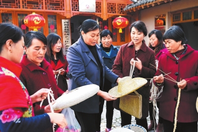 位于西和縣包集鄉(xiāng)的婦女手工編織示范基地,會(huì)員們趕制預(yù)訂的民俗產(chǎn)品。
