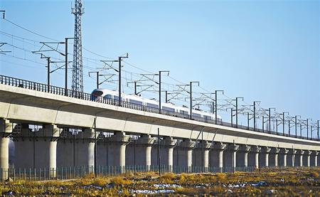 12月15日,列車從吳忠南特大橋飛馳而過。(孟捷)