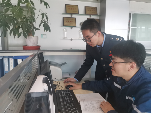 稅務干部深入企業(yè)實地核實環(huán)保數(shù)據(jù)提取情況。(甘肅省稅務局供圖)