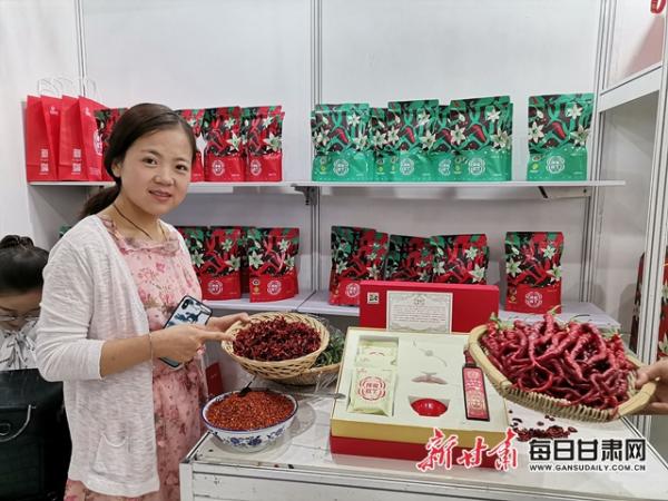 甘味農(nóng)產(chǎn)品榆中展銷(xiāo)館里,企業(yè)人員推介甘谷辣椒。新甘肅·甘肅日?qǐng)?bào)記者?王朝霞?攝