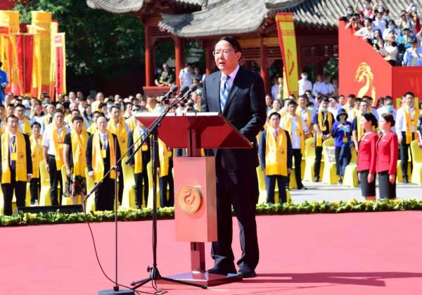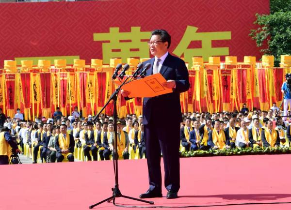 上午9時30分許,省委副書記、省長任振鶴,省政協(xié)主席歐陽堅等緩步來到伏羲廟廣場,出席公祭大典。歐陽堅主持公祭大典。