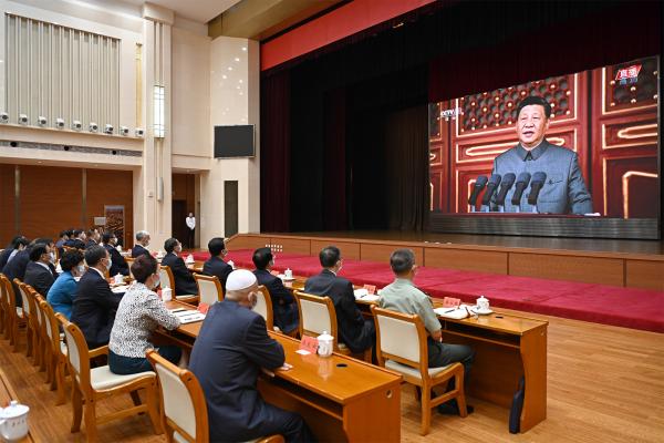 7時(shí)53分許,在歡快的樂曲聲中,習(xí)近平等黨和國家領(lǐng)導(dǎo)人來到天安門城樓主席臺(tái),會(huì)場(chǎng)爆發(fā)出熱烈的掌聲。8時(shí)整,慶祝大會(huì)開始,中國人民解放軍聯(lián)合軍樂團(tuán)奏響雄壯的《義勇軍進(jìn)行曲》,尹弘、任振鶴等全體起立,隨北京現(xiàn)場(chǎng)一起高唱中華人民共和國國歌,目視大屏幕里鮮艷奪目的五星紅旗冉冉升起,在天安門廣場(chǎng)上空迎風(fēng)飄揚(yáng)。在熱烈的掌聲中,習(xí)近平總書記發(fā)表重要講話,大家認(rèn)真聆聽、專心筆記,第一時(shí)間深刻學(xué)習(xí)領(lǐng)會(huì),不時(shí)報(bào)以熱烈的掌聲。