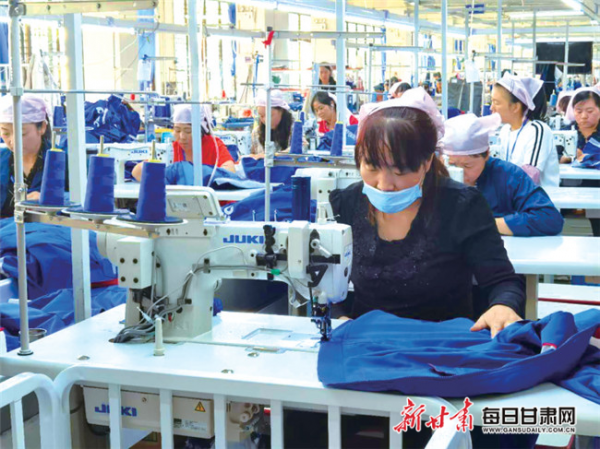 甘肅榕發(fā)服裝智造扶貧車間工作人員制作服裝。