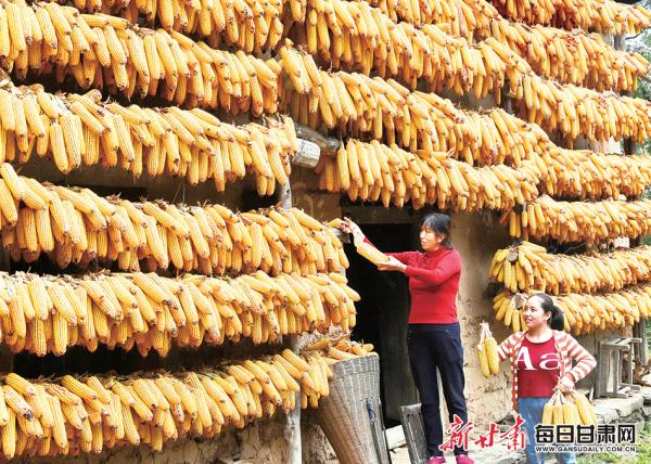 康縣寺臺(tái)鎮(zhèn)黃莊村吳家那社村民張桂萍和兒媳候輝正在懸掛晾曬玉米,屋檐下一道金燦燦的豐收景象。