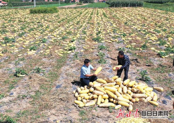 寧縣春榮鎮(zhèn)谷和春農(nóng)民專業(yè)合作社大田里農(nóng)民在展示喜獲豐收的南瓜。