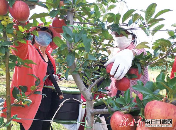 鎮(zhèn)原縣平泉鎮(zhèn)海越蘋果基地農(nóng)民在采摘蘋果,今年當(dāng)?shù)靥O果喜獲豐收。