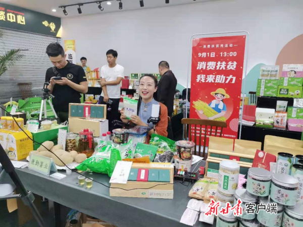 中國消費扶貧生活館甘肅館里,網(wǎng)紅正在直播帶貨。