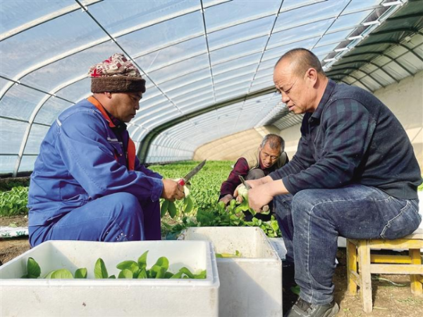 董玉明的堂弟董玉福當天也在大棚里忙碌。隨著現(xiàn)在村里的日子越過越紅火,村民們對蔬菜水果的要求也越來越高。董玉福說以前過年大家都是“屯菜”,一次性買上六七天甚至十幾天的菜,慢慢吃?!艾F(xiàn)在生活好了,大家對蔬果的要求也高了,吃菜也要吃新鮮的。今年過年期間,我們這個棚里的油麥菜、茼蒿賣得可紅火了。”董玉福說。