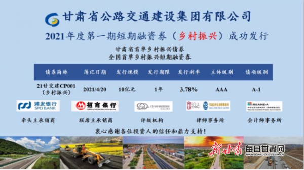 新甘肅客戶端蘭州訊(新甘肅·甘肅日報記者 杜雪琴)4月20日,省公交建集團成功發(fā)行2021年度第一期短期融資券(鄉(xiāng)村振興),發(fā)行規(guī)模10億元,期限1年,發(fā)行利率3.78%。該筆債券是我省首單鄉(xiāng)村振興債券,債券募集資金主要用于省公交建集團牽頭實施的鄉(xiāng)村振興基礎設施項目。