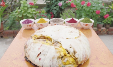 “像是拿破侖蛋糕,更像張掖的七彩丹霞?!狈旨瘜а輻钐K燁告訴記者:“在當?shù)卣{(diào)研才真正吃到這種蘭州‘拿破侖’,五種不同的香料,辛、咸、香、甜,有的負責味蕾,比如玫瑰、紅曲;有的突出氣息,比如胡麻、姜黃、香豆;在吃的時候總能聯(lián)想起唐代禮樂圖,有點玄幻……也許是潛意識里是將這種融合了不同文化的食物與開放包容的漢唐時期聯(lián)想到了一起?!?/p>