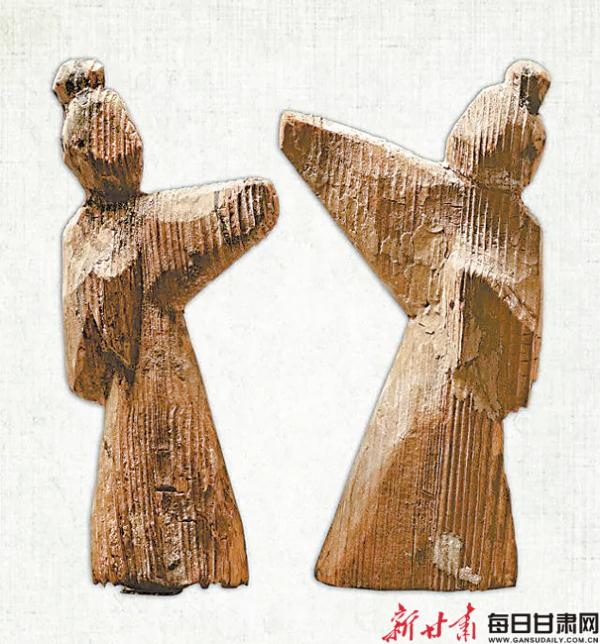 武威磨嘴子漢墓出土,現(xiàn)藏甘肅省博物館的兩件彩繪木舞蹈俑,其中一件寬4.9厘米,厚3.5厘米,高26.7厘米。木俑梳高髻,著長(zhǎng)袍,身體向右傾斜,左臂置于胸前,右臂舉起,頭微側(cè),作舞蹈狀。另一件木俑底寬5.4厘米,高14.5厘米,削制而成。以黑、紅兩色繪五官和衣領(lǐng)等。木俑挽高髻,穿袍服。左臂撫胸,右臂向前上舉起,身子傾斜,作舞蹈狀。它們和同一地點(diǎn)出土的漆樽舞蹈畫一樣,都是現(xiàn)實(shí)生活中官僚貴族富戶舞伎的藝術(shù)再現(xiàn)。
