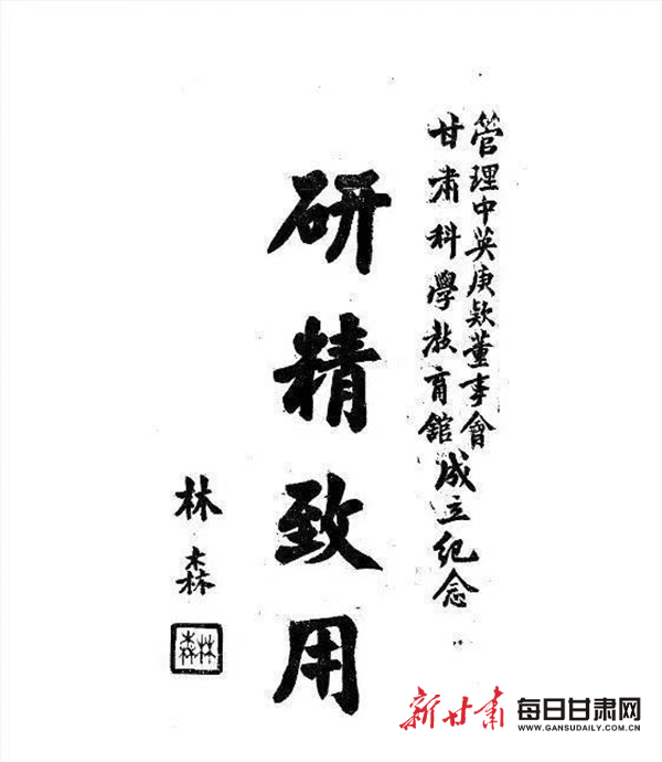 1939年元旦,甘肅科學(xué)教育館成立,林森特題寫了“研精致用”以為鼓勵。其上款為:管理中英庚款董事會、甘肅科學(xué)教育館成立紀(jì)念;下款為:林森,蓋朱文印。