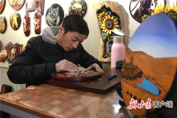 王洋在創(chuàng)作木雕畫《反彈琵琶》