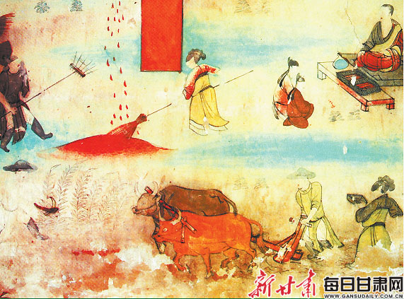 在敦煌莫高窟壁畫中也有許多反映耕地、牛拉車等生活化的場景。
