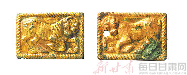 除了銅牌飾,還有戰(zhàn)國時(shí)期的鎏金銅臥牛形牌飾、透雕虎噬牦牛銅帶鉤。平?jīng)鍪胁┪镳^藏鎏金銅臥牛形牌飾,文物整體作牛狀,牛首枕于前蹄上,雙角間作圓穿,尾部作條形穿,四蹄盤曲。脊、腹、腿局部以細(xì)斜線作毛狀。正面通體鎏金,背面下凹,背面中部作兩橫梁,有條形穿。牛體肥碩,睡態(tài)安詳。