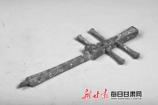 因墓葬自然塌陷,雨水沖擊,出土時琵琶音箱已殘損。琵琶為四弦,殘長28.5厘米,其中柄頭長14.3厘米,柄桿長12.2厘米;與音籍銜接處有榫,長2厘米。弦軸為螺施式,長7.2厘米,上弦的一頭鉆小孔,柄頭開有軸槽。前面,四根弦軸全露,長6.5厘米,上寬0.6厘米,下寬1厘米;后面,露上面兩弦軸,長3厘米,寬0.5厘米。琵琶用質(zhì)量較高的硬木制作,做工精細,前后左右鑲嵌骨制梅花,柄頭兩側(cè)各鑲嵌7朵,大小相間,互相對稱,前后大小各嵌15朵;柄桿前面嵌大的3朵,后嵌小的7朵,左右大小交錯各嵌5朵。