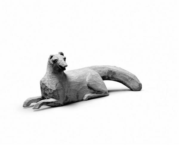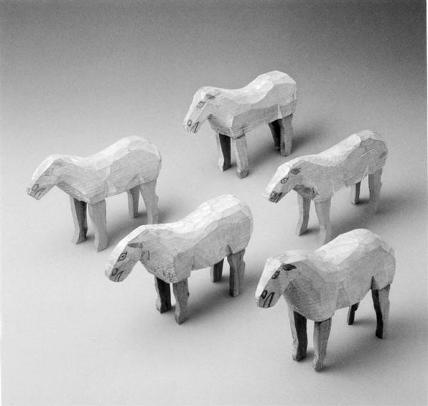 這些動物類木雕用料以松木、楊木等河西地區(qū)易得木料為主。有的是用一段木頭整體削斫而成,如木猴、木雞、木狗、木鵝等。有的則是分別雕刻出動物的頭部、軀體、四肢、尾巴、耳朵和獸角等,然后組合在一起,如木牛、木馬等。這些動物類木雕的尺寸大小不一,一般來說大型家畜如馬、牛和獨角獸相對大一些,狗、羊、鵝等相對小一些,還是具有一定的寫實意義。