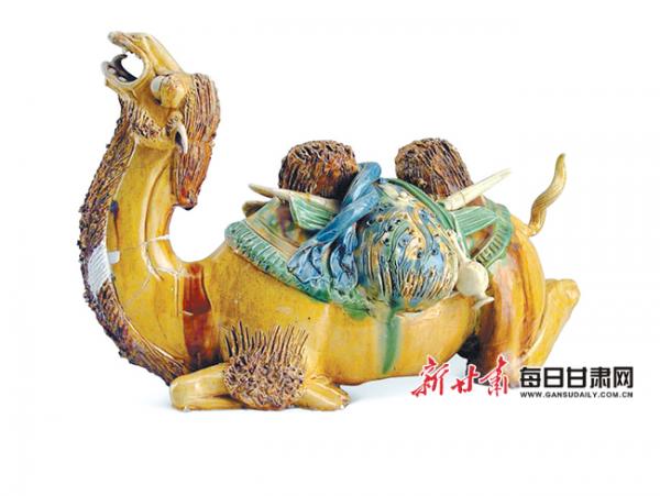 三彩鳳首壺當(dāng)時(shí)不只廣泛流行于國(guó)內(nèi),還被行銷(xiāo)到域外。2002年西安市長(zhǎng)安區(qū)郭杜鄉(xiāng)唐墓出土了一件三彩釉陶載物臥駝,真實(shí)地再現(xiàn)了絲綢之路上對(duì)外貿(mào)易的景象:臥駝的雙峰間除了負(fù)馱象牙和絲綢外,其側(cè)面還非常醒目地掛著一件鳳首壺。鳳首壺本來(lái)是借鑒胡瓶制作的,經(jīng)過(guò)中國(guó)人的一番中西合璧的改造,又作為“中國(guó)制造”的特色商品被販運(yùn)回西域各國(guó)了?!澳脕?lái)”復(fù)“拿去”,這是大唐開(kāi)放兼容的胸襟氣度,這是中國(guó)人廣采博收善于學(xué)習(xí)的精神!