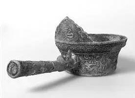 讓我們先看看這個熨斗:這是一件漢代家庭使用的生活工具,從外形來看,它通長28厘米,柄長16厘米,勺徑12厘米。柄、勺分別鑄造后焊接而成,勺圓口,寬折沿,微侈,圓腹,圓底,外沿下一圈弦邊。沿下焊柄,柄呈平面,圓底條狀,柄首呈張口龍頭形,勺內(nèi)有黑色炭跡。這是兩千年前漢代人使用時留下來的痕跡。在勺的外側(cè),還有一塊類似銘文的東西。