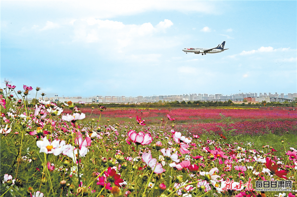 昔日荒灘變花園,臨港花海扮靚機(jī)場。