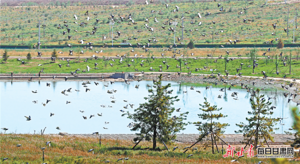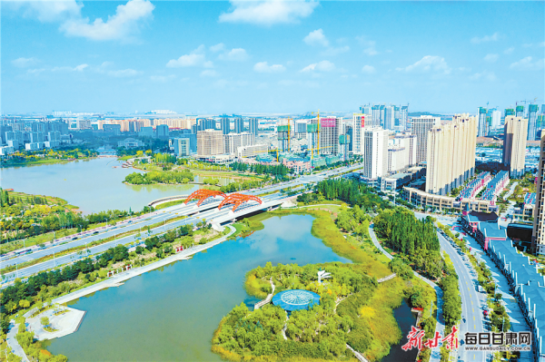 幾只風(fēng)箏在碧藍(lán)的天空中迎風(fēng)飄起,與白云一起嬉戲;寬敞的道路兩旁綠草如茵,百花齊放;湖泊綠意濃濃,游客漫步在綠樹掩映的濕地公園里,看水鳥翩翩起舞……一座生態(tài)之城迅速在這里崛起。