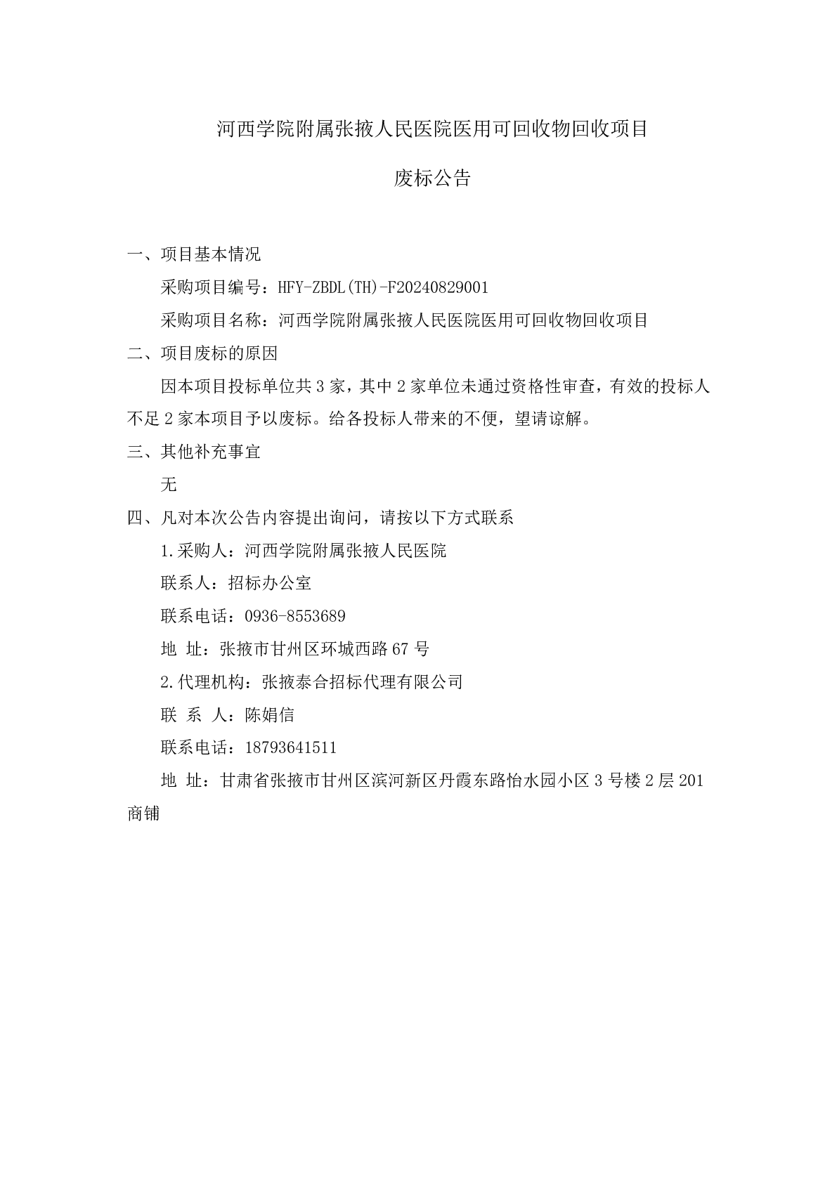 河西學(xué)院附屬?gòu)堃慈嗣襻t(yī)院醫(yī)用可回收物回收項(xiàng)目廢標(biāo)公告