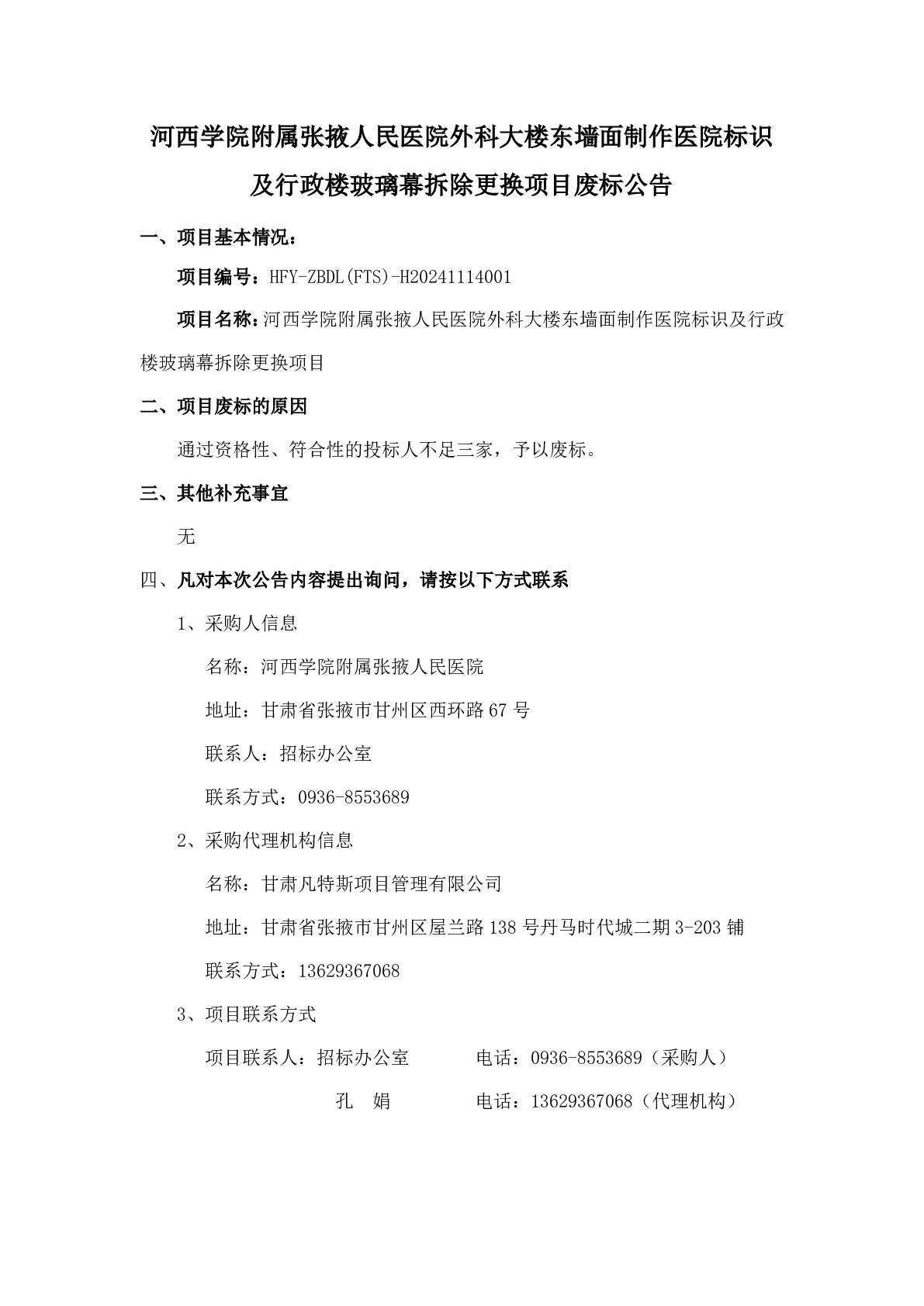 河西學(xué)院附屬?gòu)堃慈嗣襻t(yī)院外科大樓東墻面制作醫(yī)院標(biāo)識(shí)及行政樓玻璃幕拆除更換項(xiàng)目廢標(biāo)公告