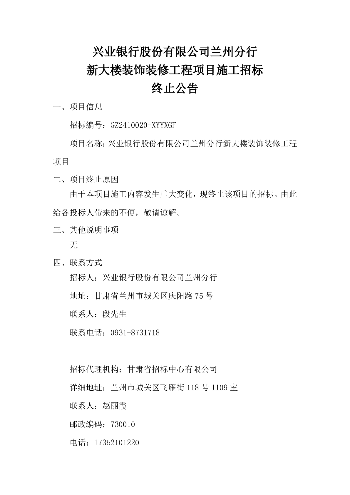 興業(yè)銀行股份有限公司蘭州分行 新大樓裝飾裝修工程項(xiàng)目施工招標(biāo) 終止公告