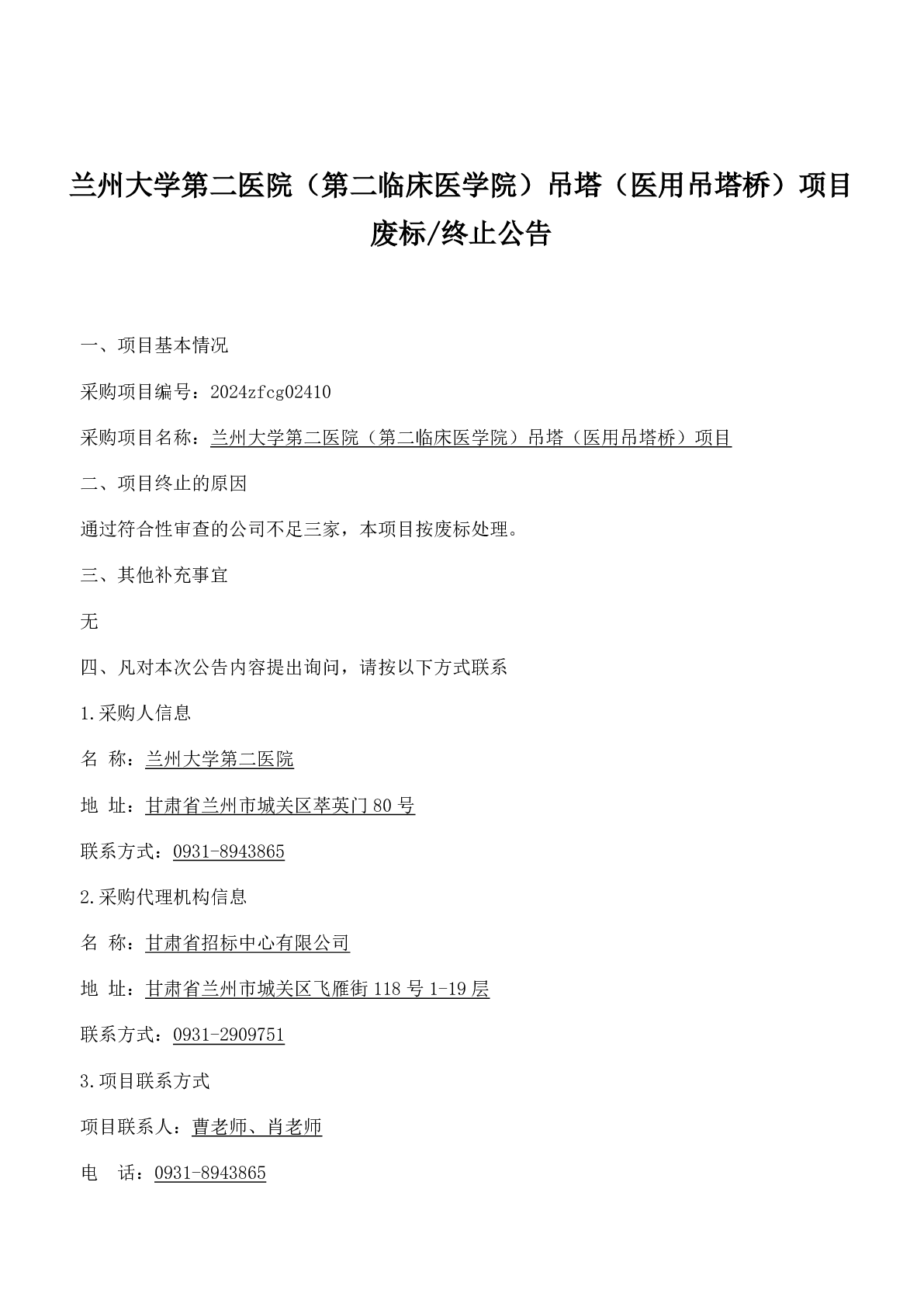 蘭州大學(xué)第二醫(yī)院(第二臨床醫(yī)學(xué)院)吊塔(醫(yī)用吊塔橋)項(xiàng)目 廢標(biāo)/終止公告