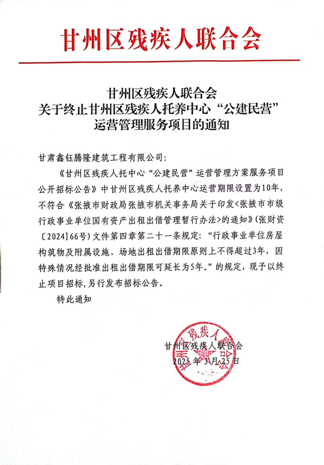 甘州區(qū)殘疾人托養(yǎng)中心“公建民營(yíng)”運(yùn)營(yíng)管理方案服務(wù)項(xiàng)目終止公告