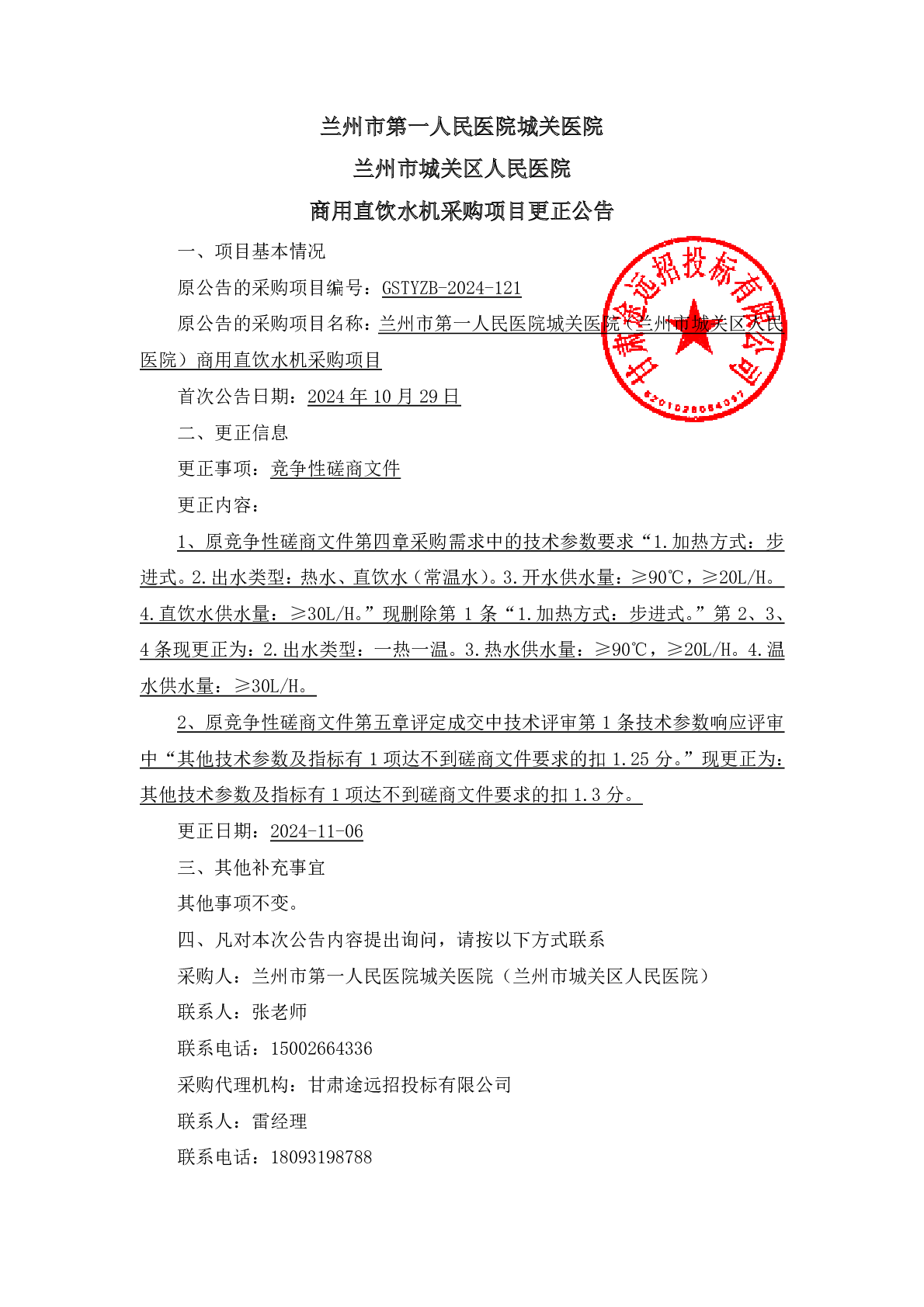 蘭州市第一人民醫(yī)院城關(guān)醫(yī)院(蘭州市城關(guān)區(qū)人民醫(yī)院)商用直飲水機(jī)采購(gòu)項(xiàng)目更正公告