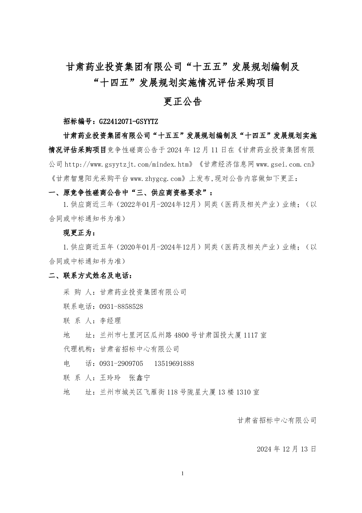 甘肅藥業(yè)投資集團有限公司“十五五”發(fā)展規(guī)劃編制及 “十四五”發(fā)展規(guī)劃實施情況評估采購項目 更正公告
