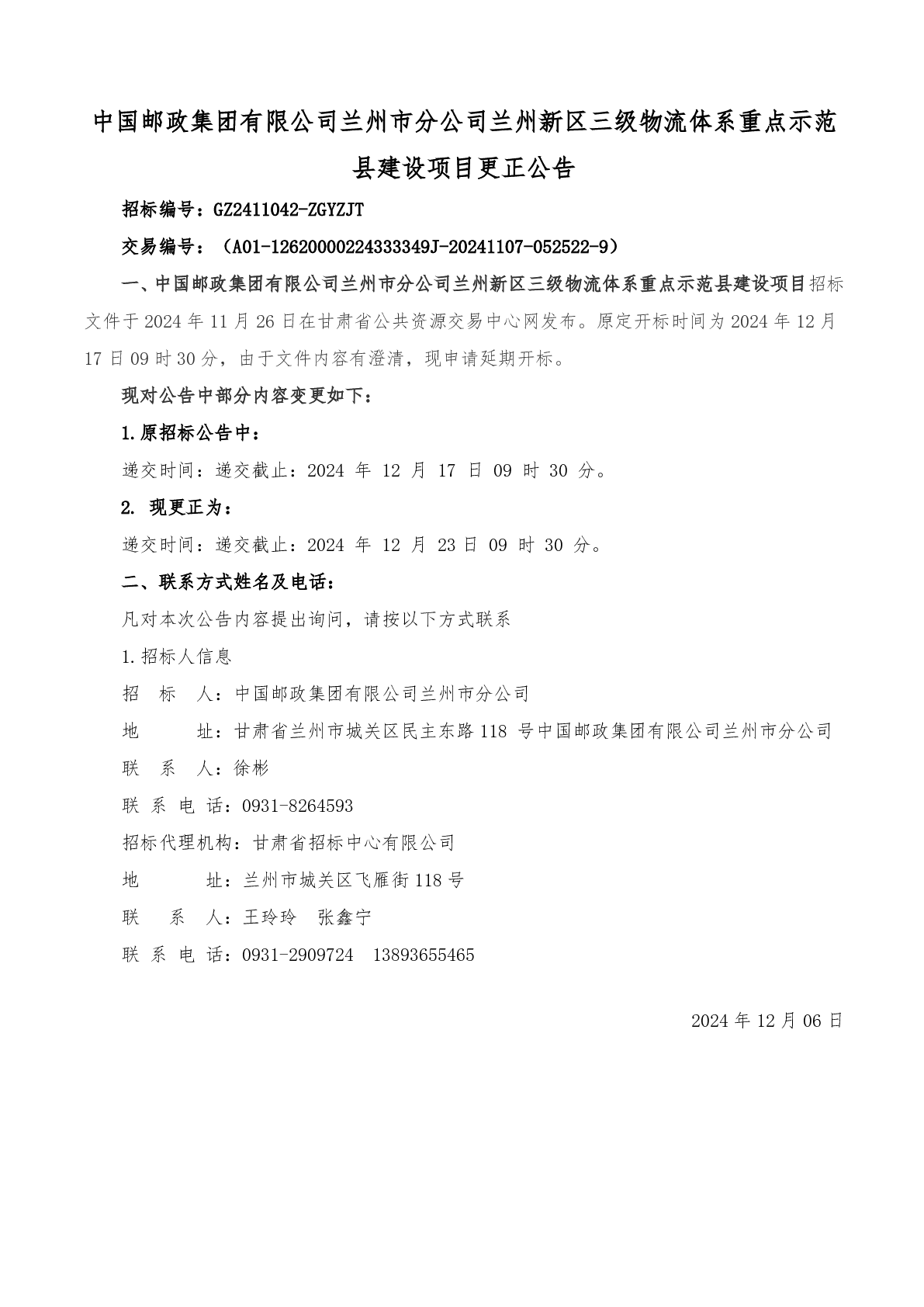 中國郵政集團有限公司蘭州市分公司蘭州新區(qū)三級物流體系重點示范 縣建設項目更正公告