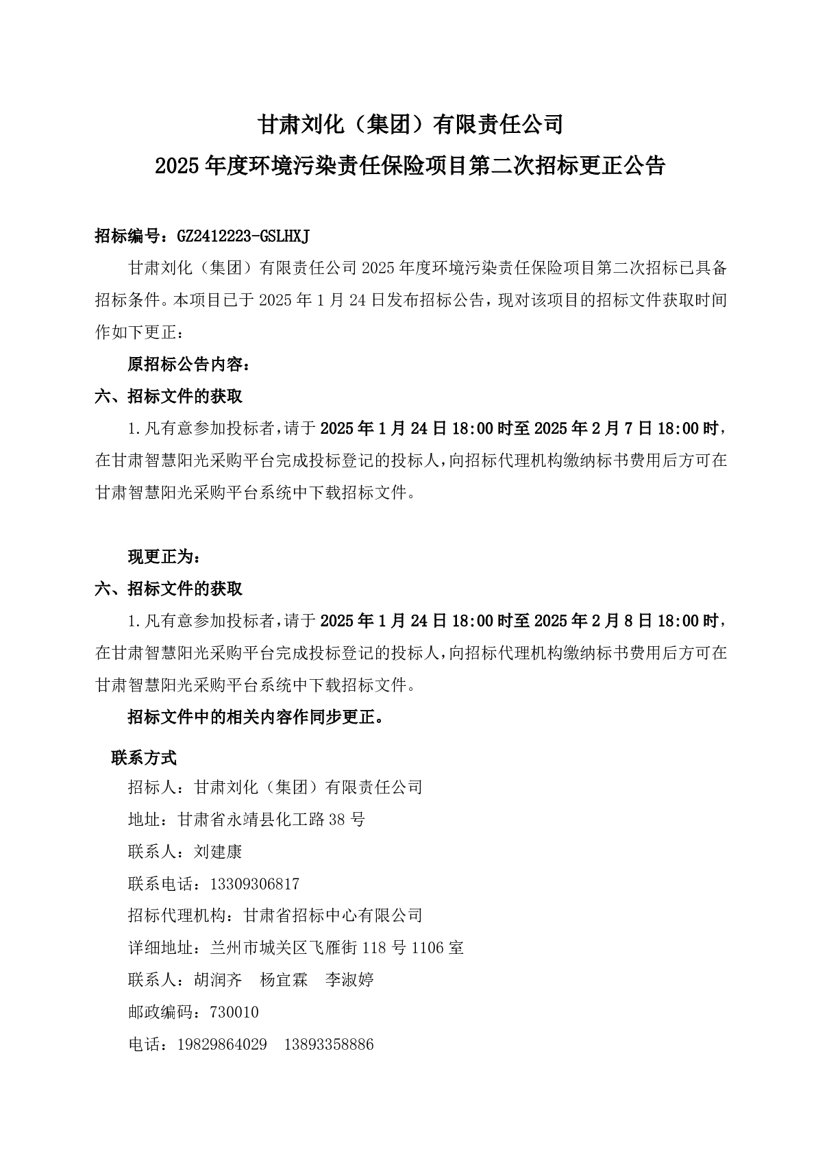 甘肅劉化(集團(tuán))有限責(zé)任公司 2025 年度環(huán)境污染責(zé)任保險項(xiàng)目第二次招標(biāo)更正公告