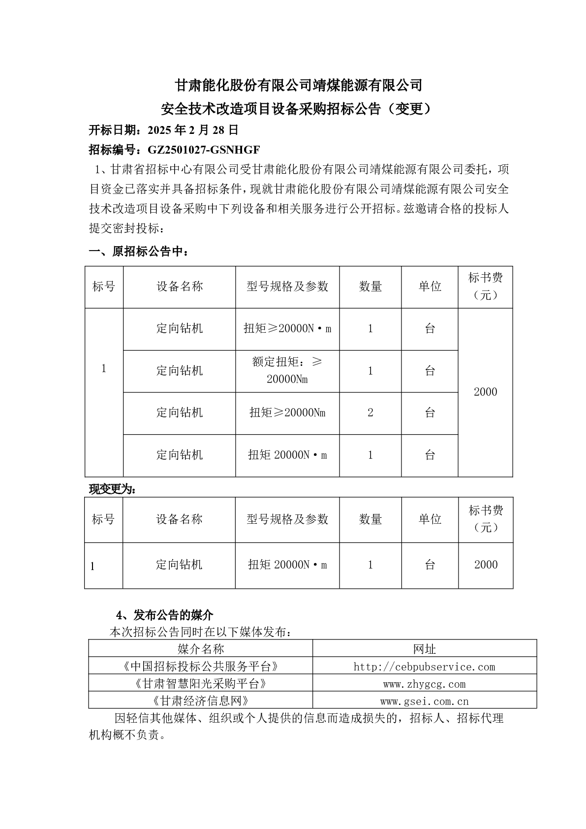 甘肅能化股份有限公司靖煤能源有限公司 安全技術(shù)改造項(xiàng)目設(shè)備采購招標(biāo)公告(變更)